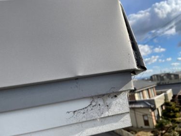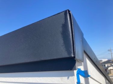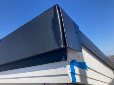 片流れ屋根の棟包板金がしっかり掴み込まれていないため、浮いています。