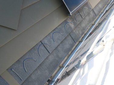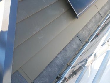 隅に施工してある屋根材は雨仕舞の関係上、釘を留めれずコーキングで接着してありますので、マクキッターでイージーガードを差し込むための隙間を作りました。