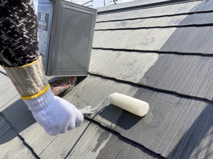 屋根塗料で塗装をします。カラーはお客様でお選びいただけますので、シミュレーションを使って決めれます。