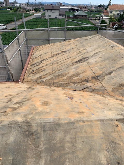雨漏りや破損が発生していなくても、瓦屋根からオークリッジスーパーに葺き替えるメリットはたくさんあります。↓こちらは、瓦を外した状態です。