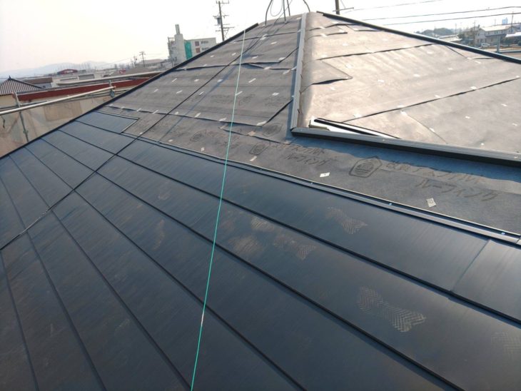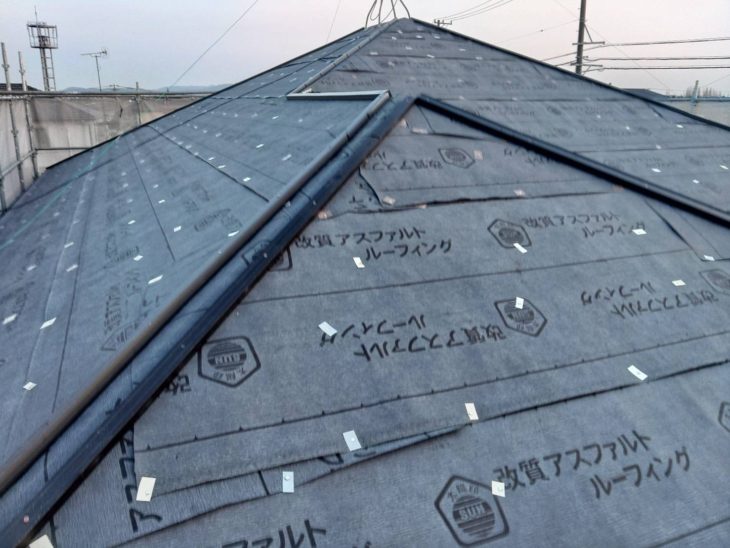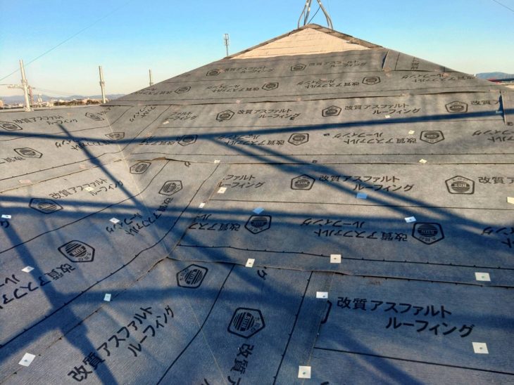 既存の屋根の上からルーフィング(防水紙)を張ります。板金下地施工
