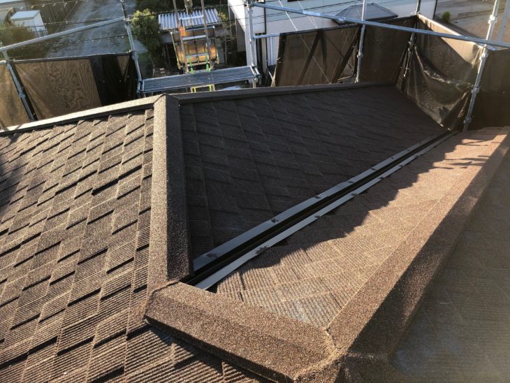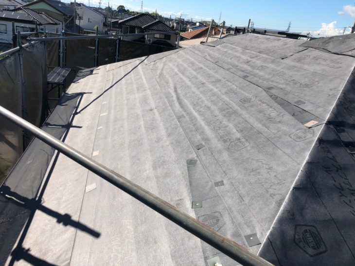 屋根材が乾いたら新しい防水紙(ルーフィング)を張ります。本体施工