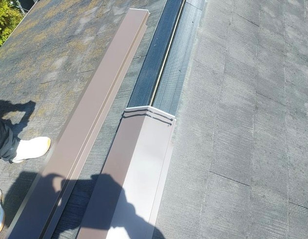 陸棟(地面と平行になる棟の部分)の交換も行いました。木下地が腐食ていたため、こちらも撤去し樹脂製の下地材に交換し、棟板金を留め付けていきます。