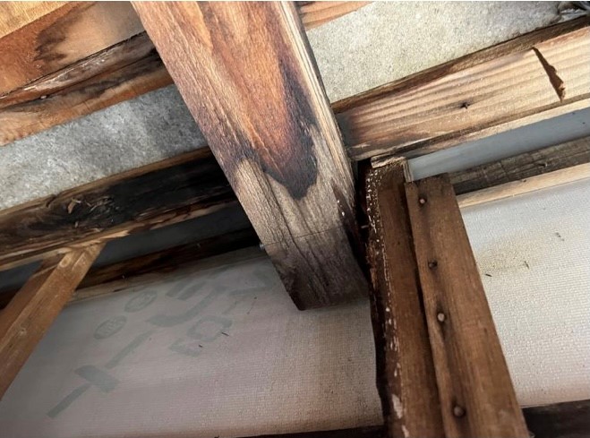 雨漏りは一度止まったと思っても、直ったわけではなく、漏っているところに一度溜まって溢れて出てくることで、止まったと思っていた雨漏りが再発します。軒天の一部をめくると、水が入った後がありました。