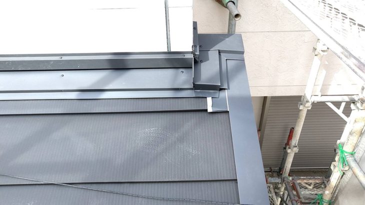 屋根材が瓦やスレート等でも外壁との取り合い部には板金が使われています。