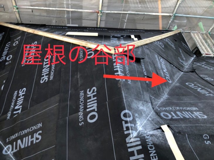 谷樋の下には下葺き材と呼ばれる防水シート(ルーフィング)が貼られ、万が一谷板金に穴が開いても雨水が屋根の中に侵入するのを防いでいます。