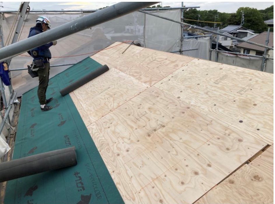 新しくコンパネを張り二次防水となるルーフィングを施工していきます。