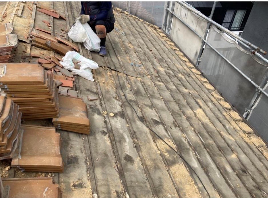 元は土葺きの屋根でしたので、瓦と瓦を固定するための土を撤去していきました。