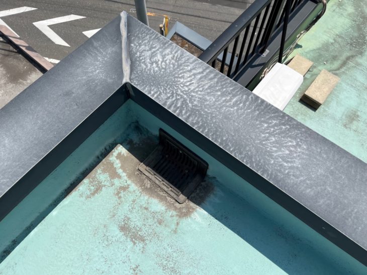 ドレン部分に詰まりなどは見られないものの周りの防水層が大きく劣化しているので、雨漏りが発生したと考えられます。