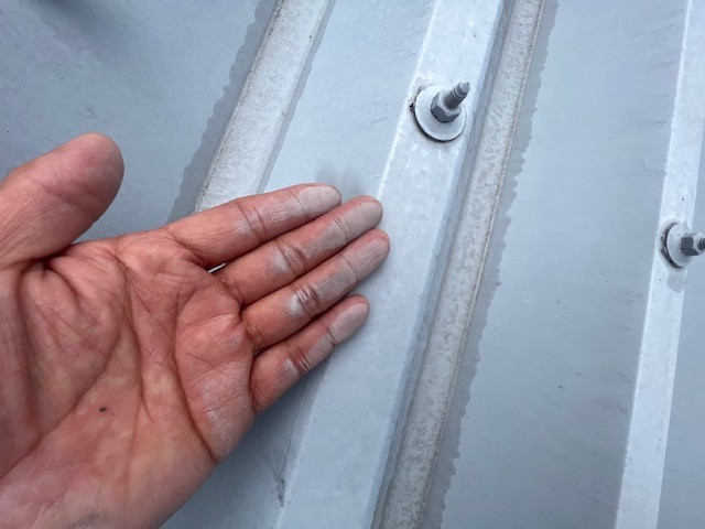 触ってみると手に粉が付きました。7年前に塗装をしたというお話しでしたが、その時に塗装した塗膜が劣化して色あせとチョーキングを起こしていました。