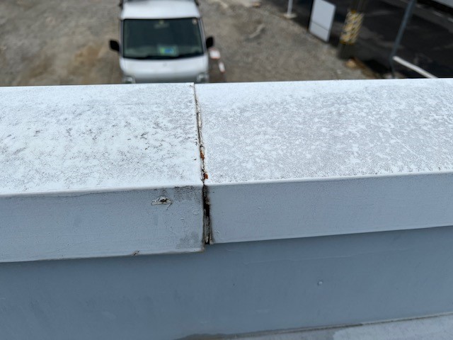 笠木と屋根材の間の立上り部分の塗膜も劣化し、コーキングも劣化が見られました。