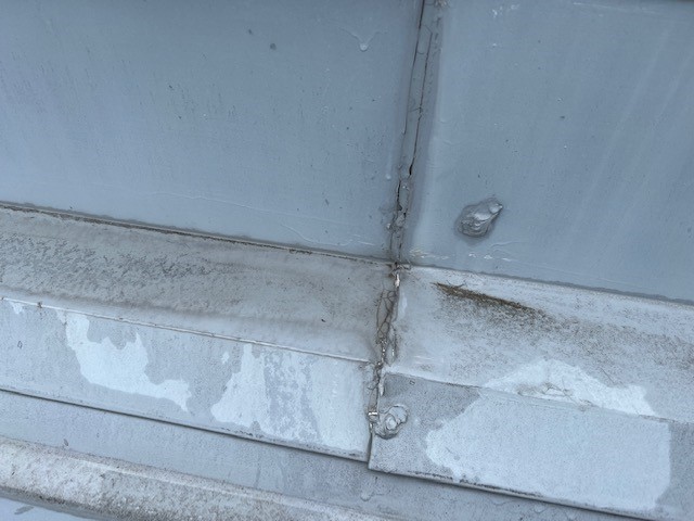 笠木と屋根材の間の立上り部分の塗膜も劣化し、コーキングも劣化が見られました。雨漏りの原因