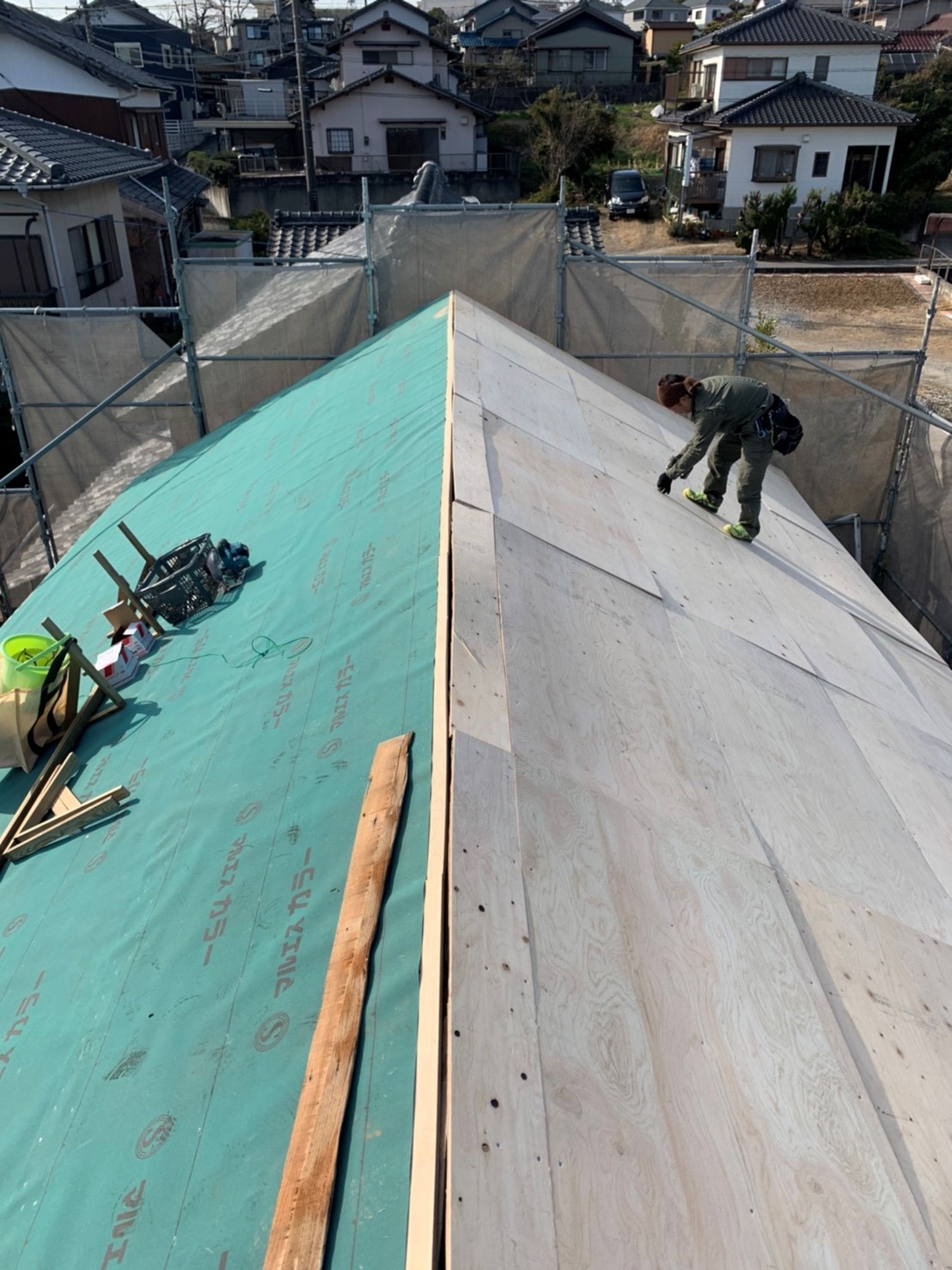 ルーフィング野地板に新しくルーフィング(防水紙)を張ります。