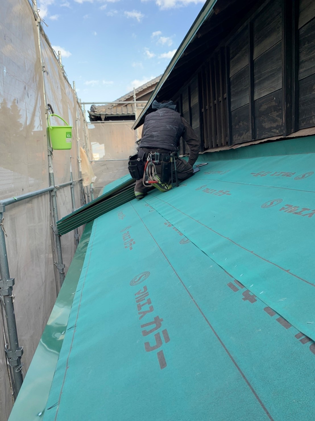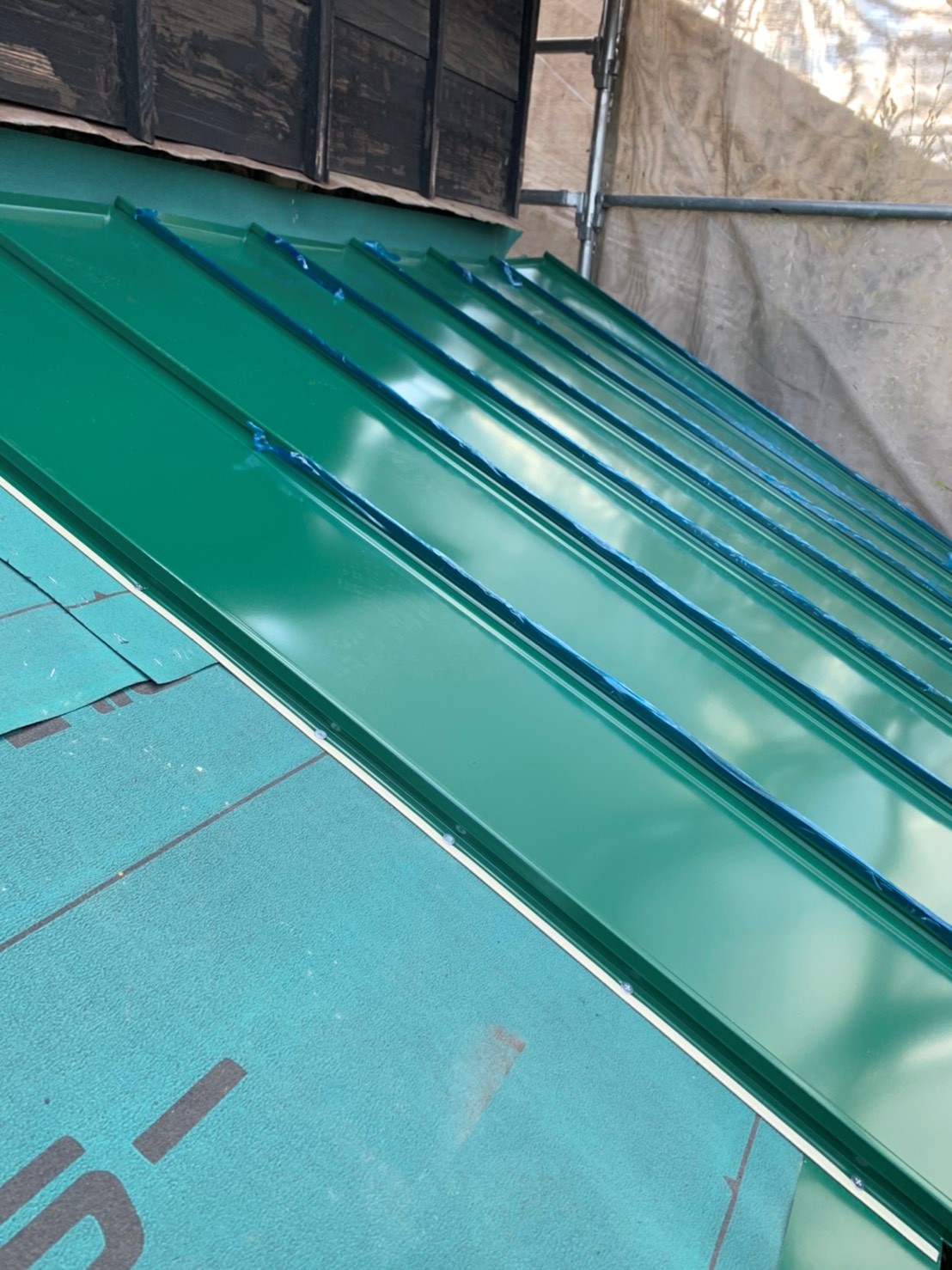 今回のお家は緑色の屋根がいいということで、緑色の板金を張ります。新しい板金は艶があって撥水性にも優れています。