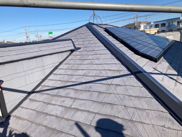 太陽光パネルが乗っているお家の屋根は、手の届く範囲でパネルの下まで施工します。雨漏りは見られませんでしたが、今後雨漏りの危険性があるので今のうちに施工をしっかりして未然に防いでいきます。