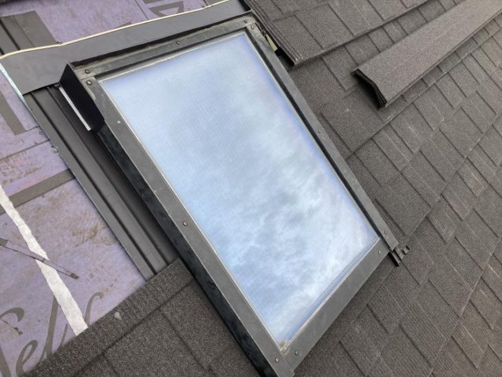 トップライトを外すとそこの部分に穴が空いてしまいますので、そこをコンパネでふさぎ上から屋根材を張ります。