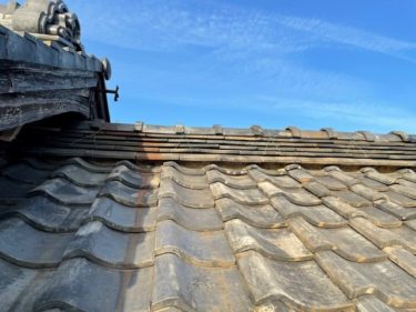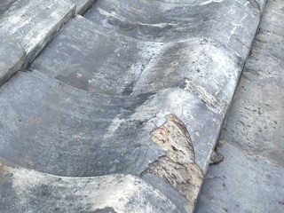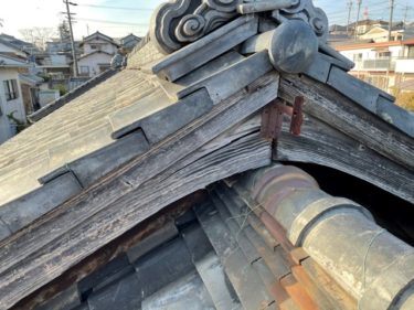 漆喰が取れて棟の土が流れ出てきています。