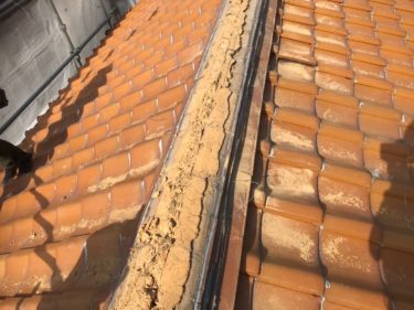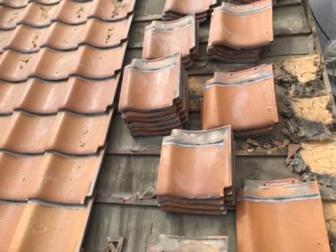 棟部から瓦をめくっていきます。ラバーロックされているので1枚ずつカッターで切り込みを入れてはがしていきます。