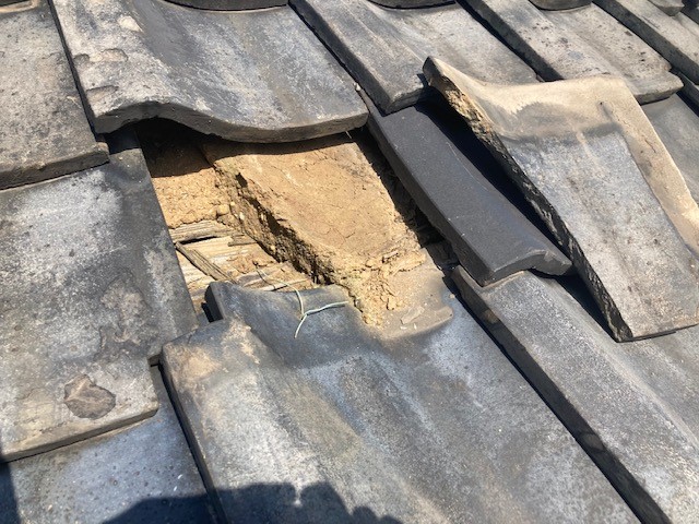 割れている瓦が長時間放置されたままだと土も痩せて下地の野地板も傷んでしまいます。