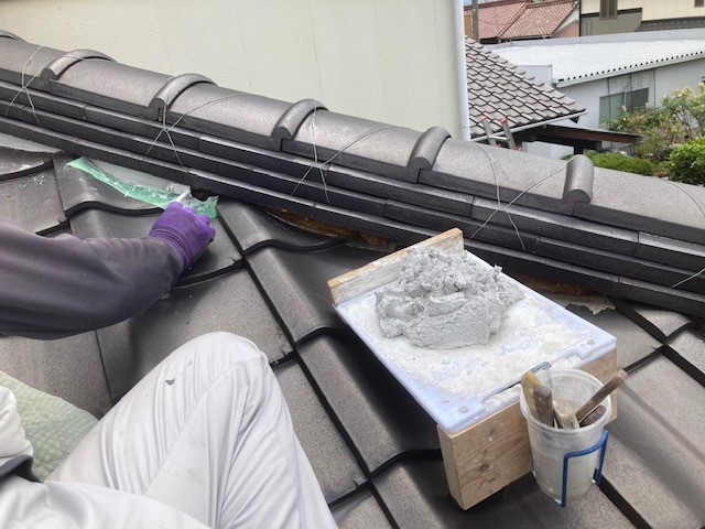 まずは、古い漆喰を撤去し新しい漆喰をのせます。その際、瓦についてしまわないように養生をしてから施工をします。