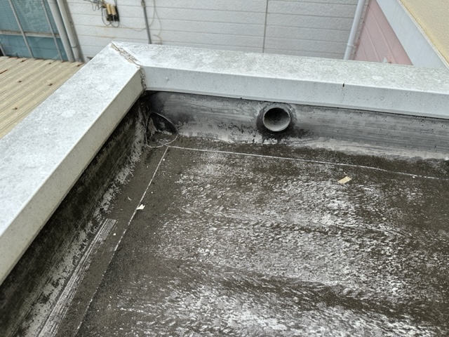 そして、ドレン周りに汚れやごみ等がたまり詰まりが見られていました。雨漏りの原因として考えられたのが、こちらの詰まりとパラペット部分のシート防水に膨れが見られたので防水層の劣化から雨漏りが起きていると考えられました。