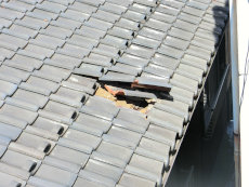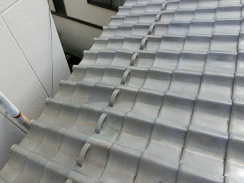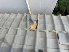 お隣のお家の調査中に目に入った瓦ズレ。台風の被害ではとても多い例です。