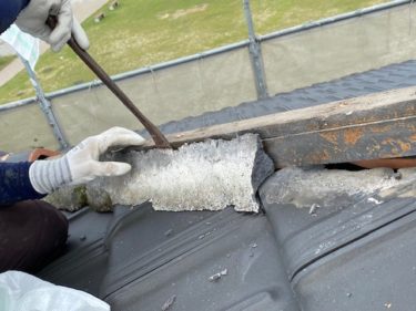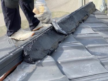 乗せた後はならしていきます。この際横にはみ出すぎたり、量が多すぎると後々瓦が乗らないので瓦の形に合わせて、形を整えていきます。
